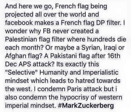My nterpretation of the above is: It is the response tothe Paris attacks that is part of thethe problem. We are so selective in how we – “we” used in the universal sense – chose which tragedies are important enough to warrant a widespread response – or a FB flag app – and which aren’t. It is a response that is basically saying only certain human lives have value. Other deaths due to extremism of any – and many – types happen every day, and yet go unacknowledged both in news services…and on social media! The incidents are either too remote, or victims too poor, or of no political value, or of no financial value or – horrifically – insignificent! The whole world doesn’t revolve around iconic cities, which is how it could be viewed, though knowing that, I also live in a city that is a potential target. Surely in a world where we hope for universal compassion, universal responses to terrorism of ALL types, universal sorrow and empathy…even the death of one bystander would be considered too many, and worthy of a universal response. Unfortunately, thousands die, and go unacknowledged…by FB, or otherwise.