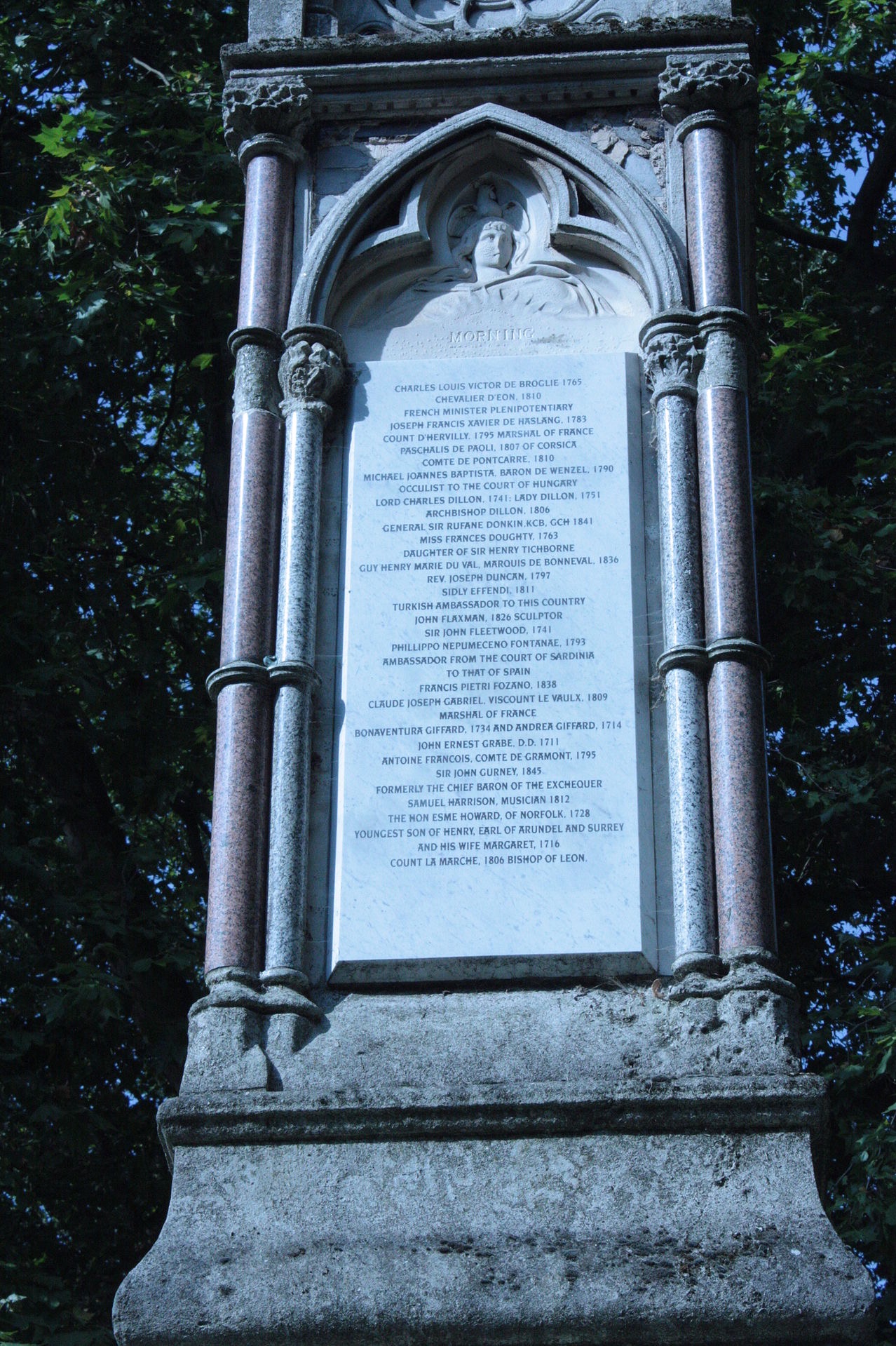 Doctors who examined the body after d’Éon’s death discovered that the Chevalier had “male organs in every respect perfectly formed”, while at the same time displaying feminine characteristics such as rounded limbs and “breast remarkably full”.[8] D’Éon’s body was buried in the churchyard of St Pancras Old Church, and d’Éon’s remaining possessions were sold by Christie’s in 1813. D’Éon’s grave is listed on Baroness Burdett Coutts’s memorial there as one of the important graves lost.