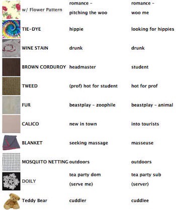 There is also this alternate list of – in my opinion – bizarre and impractical objects used for some very rare fetishes. How true-to-form this list actually is, I’m not sure. I have seen small teddy bears being displayed by guys who are into cuddling…but as for foil, ziplock bags, chamois, cocktail napkins, enema nozzles or doilies, I’ve never seen it – though perhaps because I wasn’t looking for it!
