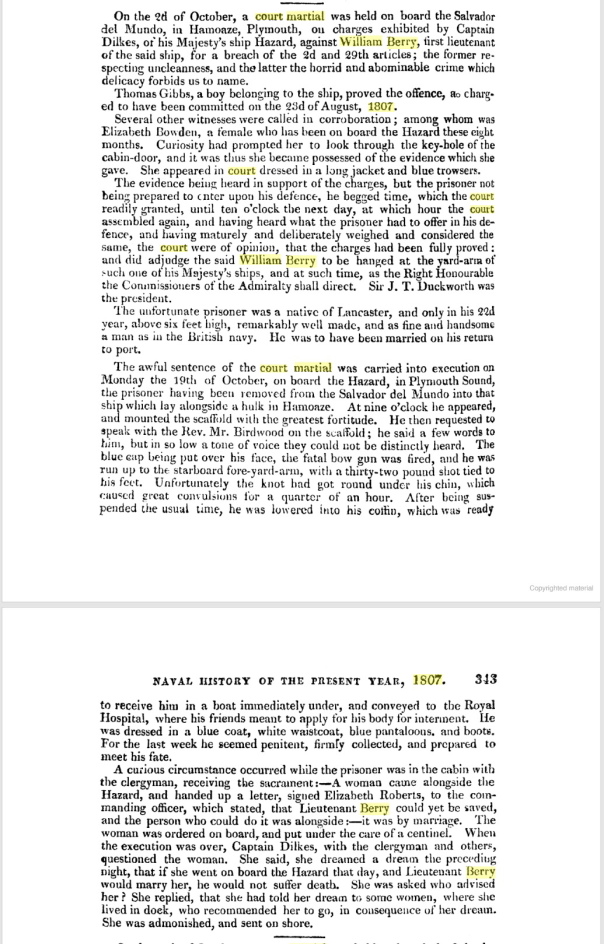 COURT MARTIAL. – On Friday a Court Martial, at which Sir J. Duckworth presided was held on board his Majesty’s ship Salvador del Mundo, in Hamoaze, Plymouth, on charges exhibited by Capt. Dilkes, of his Majesty’s ship Hazard, against W. Berry, First Lieutenant of the said ship, for a breach of the 2d and 29th articles of war; the former respecting uncleanliness; &c. the latter for the commission of a crime we do not chuse to mention. The Court having heard what the prisoner had to offer in his defence, and having maturely considered the same, was of the opinion that the charges had been fully proved, and adjudged the prisoner to be hanged at the yard-arm of such one of his Majesty’s ships, as the Commissioners of the Admiralty shall direct. One of the witnesses was a little female Tar, Elizabeth Bowden, who has been on board the Hazard these eight months. She appeared in Court in a long jacket and blue trowsers; that part of her evidence which respected the prisoner, curiosity had prompted her to observe through the key-hole of the cabin-door. (Glasgow Herald)