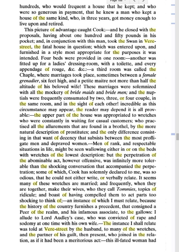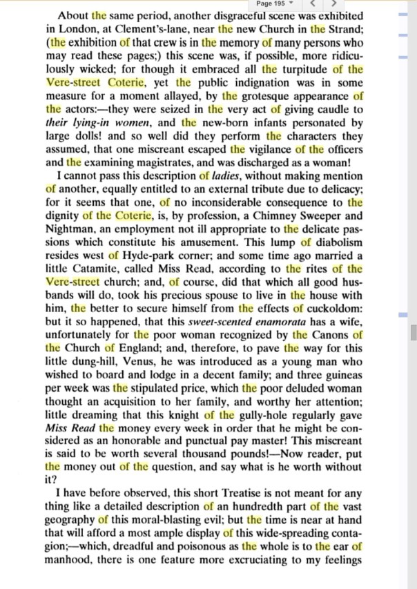 The fatal house in question was furnished in a style most appropriate for the purposes it was intended. Four beds were provided in one room – another was fitted up for the ladies’ dressing-room, with a toilette, and every appendage of rouge, &c. &c. A third room was called the Chapel, where marriages took place, sometimes between a “female grenadier”, six feet high and a “petit maitre” not more than half the altitude of his beloved wife! There marriages were solemnized with all the mockery of “bridesmaids” and “bridesmen”; the nuptials were frequently consummated by two, three or four couples, in the same room, and in the sight of each other. The uper part of the house was appropriated to youths who were constantly in waiting for casual customers; who practised all the allurements that are found in a brothel, by the more natural description of prostitutes. Men of rank, and respectable situations in life, might be seen wallowing either in or on beds with wretches of the lowest description.