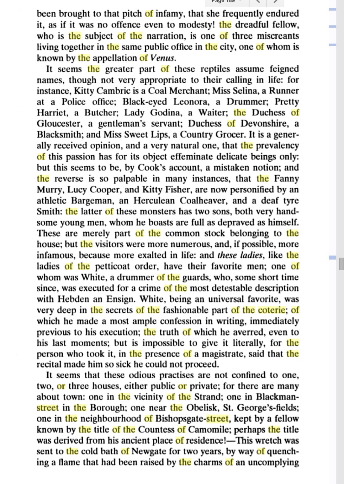 It seems the greater part of these quickly assumed feigned names, though not very appropriate to their calling in life: for instance, Kitty Cambric is a Coal Merchant; Miss Selina a Runner at a Police Office; Blackeyed Leonora, a Drummer; Pretty Harriet, a Butcher; Lady Godiva, a Waiter; the Duchess of Gloucester, a gentleman’s servant; Duchess of Devonshire, a Blacksmith; and Miss Sweet Lips, a Country Grocer. It is a generally received opinion, and a very natural one, that the prevalency of this passion has for its object effeminate delicate beings only: but this seems to be, by Cook’s account, a mistaken notion; and the reverse is so palpable in many isntances, that Fanny Murry, Lucy Cooper, and Kitty Fisher, are now personified by an athletic bargeman, an Herculean Coal-heaver, and a deaf Tyre-Smith: the latter of these monsters has two sons, both very handsome young men, whom he boasts are full as depraved as himself. These are merely part of the common stock belonging to the house; but the visitors were more numerous and, if possible, more infamous, because more exalted in life: and “these ladies”, like the ladies of the petticoat order, have their favorite men; one of whom was White a drummer of the guards, who, some short time since, was executed for sodomy with one Hebden, an ensign.