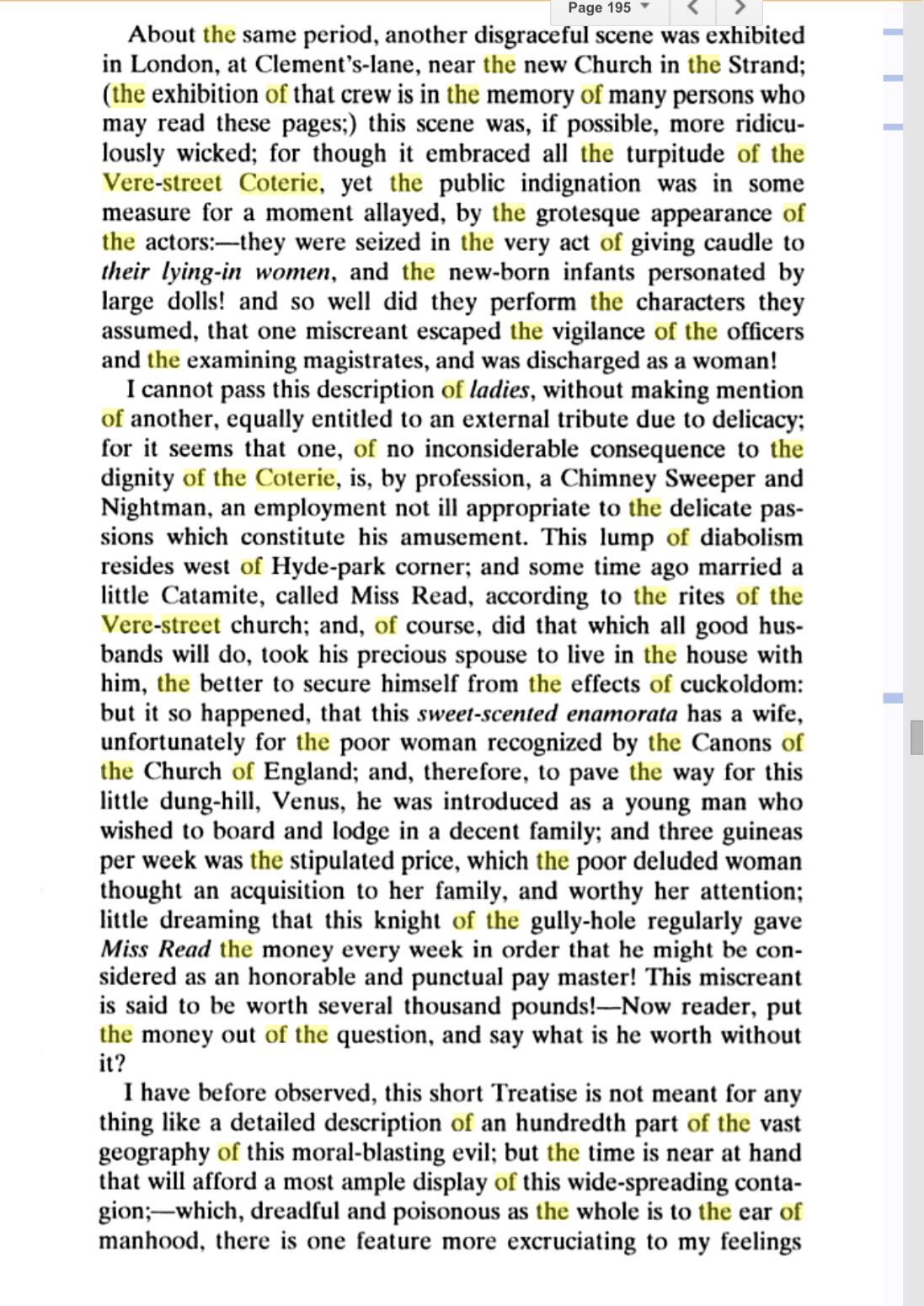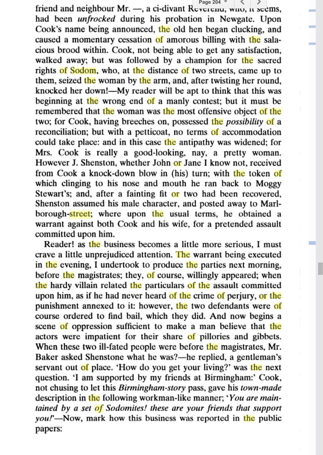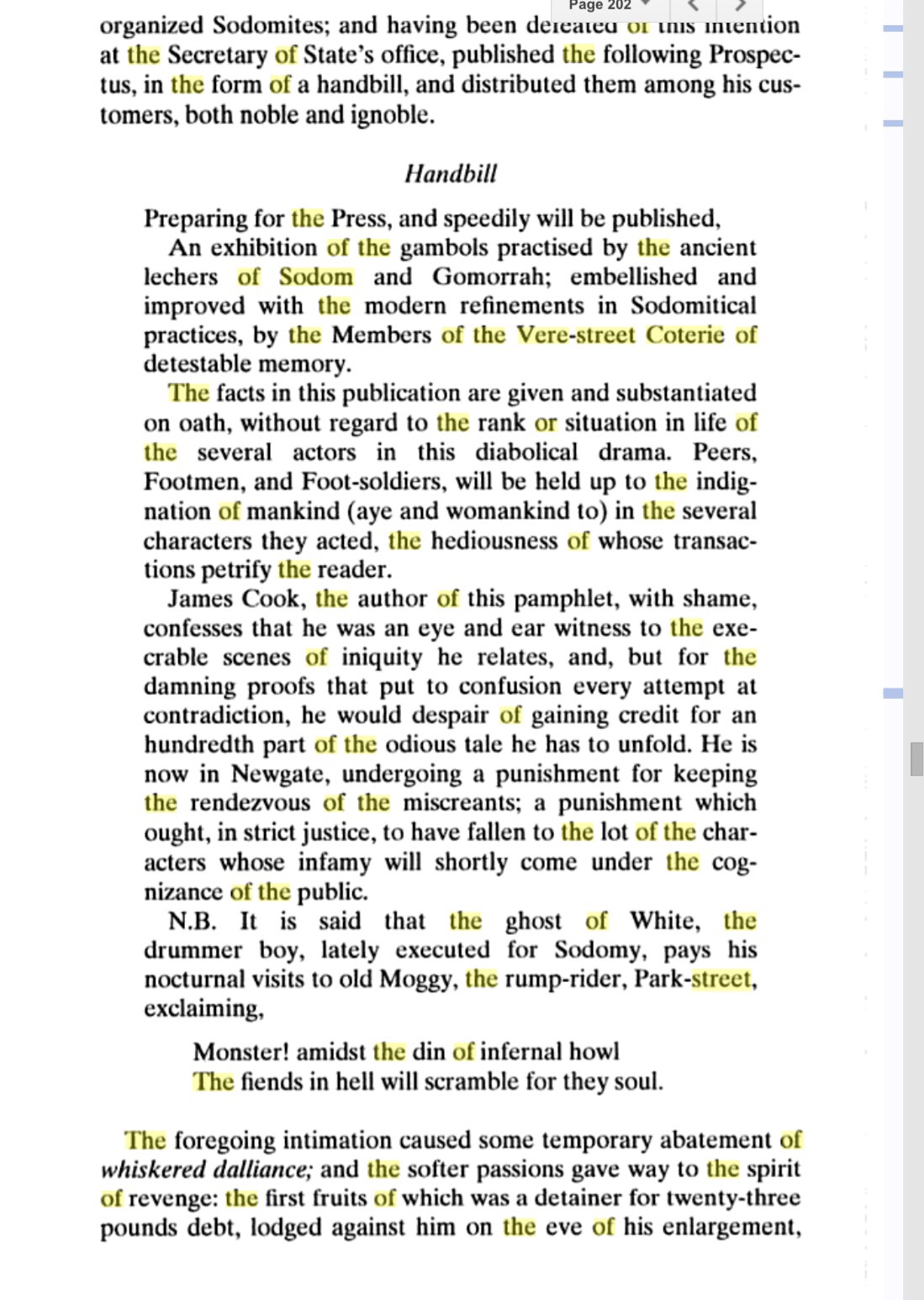 found between 40 and 50 Men making Love to one another, as they call’d it. Sometimes they would sit on one another’s Laps, kissing in a lewd Manner, and using their Hands indecently. Then they would get up, Dance and make Curtsies, and mimick the voices of Women. O, Fie, Sir! – Pray, Sir. – Dear Sir. Lord, how can you serve me so? – I swear I’ll cry out. – You’re a wicked Devil. – And you’re a bold Face. – Eh ye little dear Toad! Come, buss! – Then they’d hug, and play, and toy, and go out by Couples into another Room on the same Floor, to be marry’d, as they call’d it.