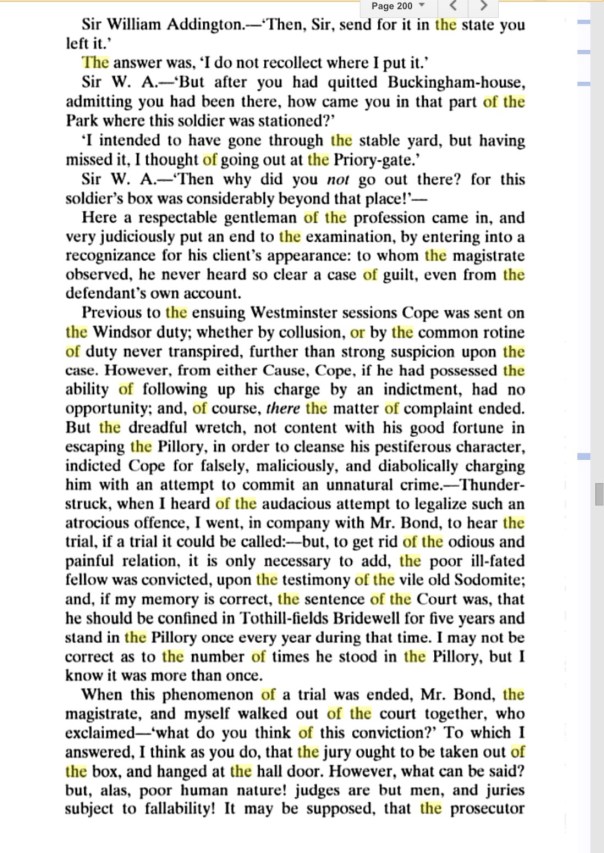 Their first queer victim was Captain Edward Rigby. Early in 1698 he had been tried for sodomy at a court-martial, at which he was acquitted. But Reverend Thomas Bray, a leading member of the Societies for Reformation of Manners, believed Rigby to be guilty, and he worked out a plan with the constabulary to entrap him using as bait the servant named Minton who had previously been approached by Rigby. Minton’s master was Rev. Charles Coates, who was a parishoner of Thomas Bray. The trial below gives all the details.