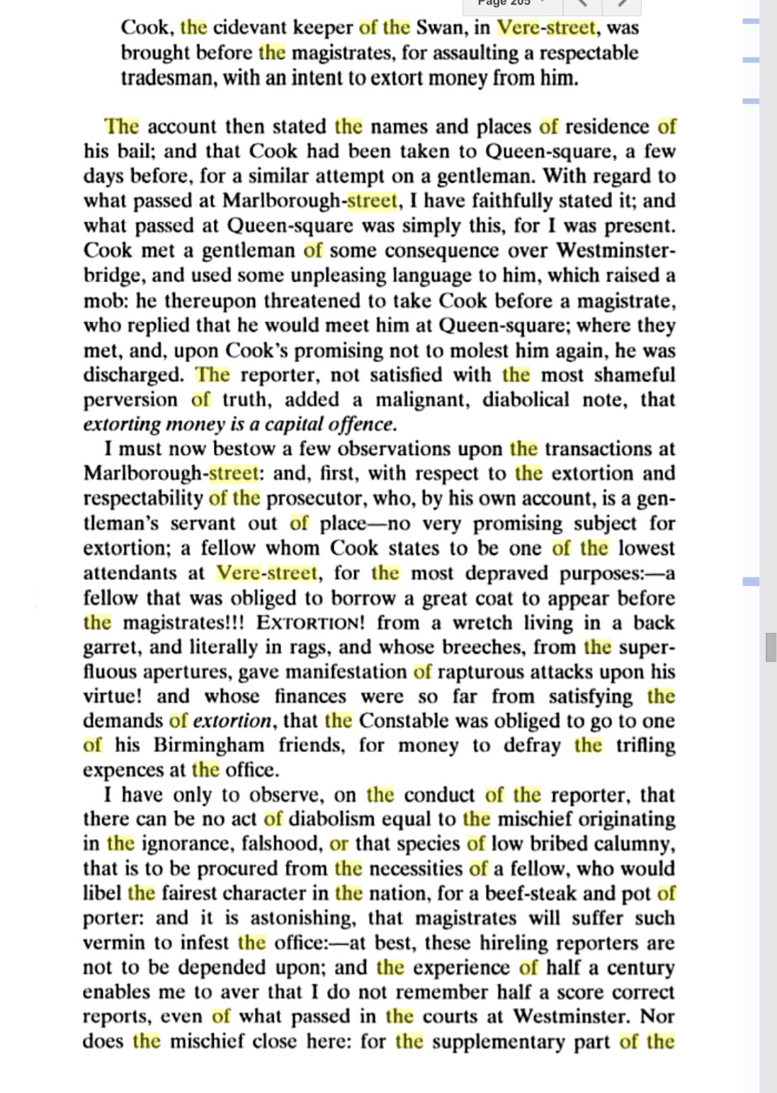 We understand that in consequence of a proposition from Cooke the Publican, and one of the miscreants who were pilloried in the Hay-market on Thursday, there was a meeting of the Westminster Magistrates on Wednesday evening, to consider his offer for discovering a number of his accomplices in the same abominable system, but in a very different rank in life, provided his punishment of the Pillory was remitted; but that the Magistrates, after full deliberation, deemed it more for the advantage of public morals to reject his proposition, and let the sentence of the law take its course. (The Times, Issue 8101)