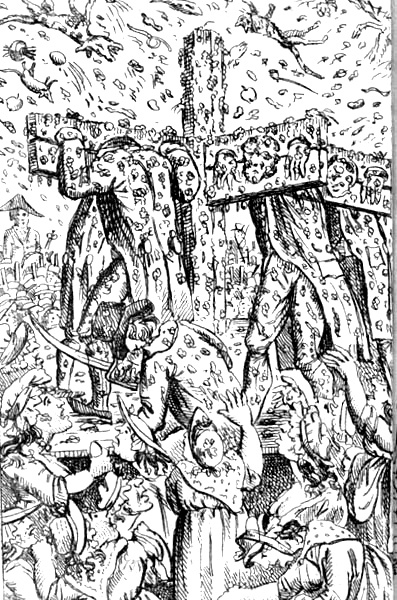 From the moment the cart was in motion, the fury of the mob began to display itself in showers of mud and filth of every kind. Before the cart reached Temple Barm, the wretches were so thickly covered with filth, that a vestige of the human figure was scarcely discernible. They were chained, and placed in such a manner that they could not lie down in the cart, and could only hide and shelter their heads from the storm by stooping. This, however, could afford but little protection. Some of them were cut in the head with brick-bats, and bled profusely. The streets, as they passed, resounded with the universal shouts and execrations of the populace. (The Times)