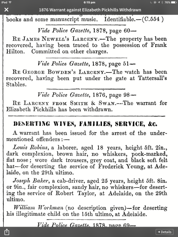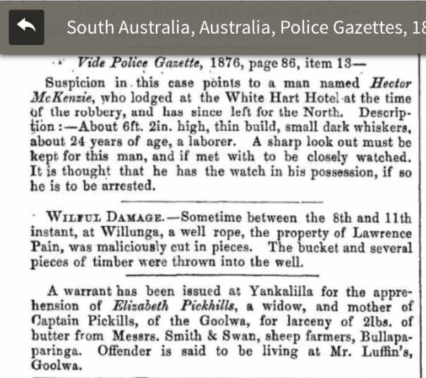 William Feancis Bomford & Clara Pickhills wedding announcement in Goolwa, South AustraliaThe second actual record we have of her here is in 1876 – and it’s in the form of a police warrant in Goolwa, South Australia. On June 21, 1876, the following notice appeared in the South Australian Police Gazette “A warrant has been issued at Yankalilla for the apprehension of Elizabeth Pickhills, a widow, and mother of Captain Pickills, of the Goolwa, for larceny of 2lbs. of butter from Messrs. Smith & Swan, sheep farmers, Bullapabaringa. Offender is said to be living at Mr. Luffin’s, Goolwa.” . Why she would feel the need to steal 2lb of butter is anybodies guess, and despite knowing that she is to end up with Alzheimer’s, I feel it is a bit early at this stage for that to be affecting her life or mental condition.