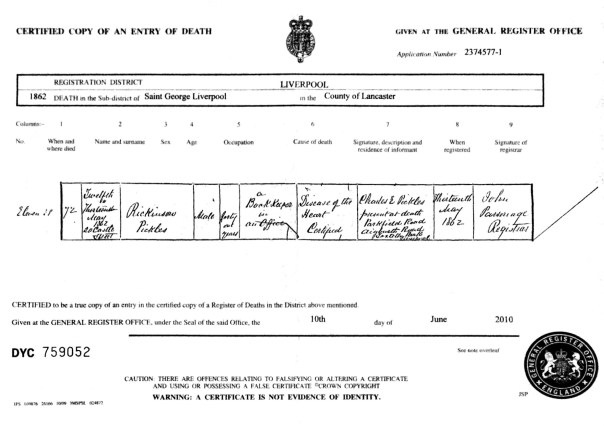 Rickinson died on May 12, 1862 at Toxteth Park, Lancashire. His obituary read “On the 12th instant, of disease of the heart at his office, 30 Castle St, aged 41 years, Mr Rickinson Pickhills“. According to his death certificate, his son Charles Edward was present at his death. He was buried at Toxteth Park Cemetery.