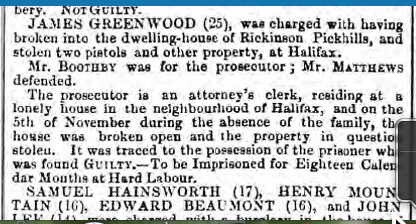 On the evening of November 5, 1846 a James Greenwood broke into the “lonely house in the neighbourhood of Halifax”, belonging to Rickinson & Eluzabeth, in the absence of the family, and stole 2 pistols, 3 dresses, and other property. He was charged, pleaded guilty, and sentenced to 18 months hard labour.
