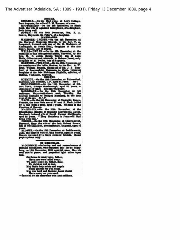 Rickinson “Pickles” Pickhills death certificate. He died at his workplace in Castle Street from a heart attack.There is a possibility that Elizabeth arrived in Australia in 1871, on the “Orient”. There is a record of a KG Pickhills and daughter arriving in Sydney on the 4th January that year. So, time for a “possible scenario”! The newspapers would have printed the passenger list from a hand-written document, so mistakes are inevitable. We know Elizabeth came out here around this time, and with Clara, who would have been 14 at this time, her only surviving child at home, it is more than likely – and with 2 son’s here already – that they emigrated together. There is no independent emigration record for Clara. They would have made their way to Goolwa, where George had a home. We have records – to follow – that definitely place Elizabeth there in 1876. We know that Clara married William Francis Bomford there in 1889 – thus it is possible she met him there, and moved to Launceston after their marriage. The marriage announcement also states that the wedding was held “in the residence of the bride”, so Clara was obviously in Goolwa at that time. At this stage, I am accepting the emigration record on the “Orient” as their arrival here. PS Have just discovered a “Thank You” letter to the Captain of the “Orient”, regarding their appreciation to the ship’s doctor for his kindness and care on what appears to be a rough voyage, and published in December 1870. Two of the signatrees are Clara & Elizabeth Pickhills. My assumption was right.