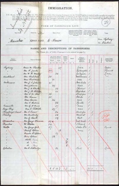 The book “A Land Abounding” mentions Elizabeth’s 1989 public indiscretion.November 1892 finds Elizabeth onboard the “Masilia” emigrating back to England. As with so many aspects of her life, assumptions have to be drawn about the reasons behind her actions. I feel there are two scenario’s that could have prompted her return to England: (A) She just didn’t like it here, being a bit more casual, and not as “modern” as England, with a totally different climate, the tyranny of distance, the remoteness, or (B) her dementia was becoming a problem for her son’s, and they were finding her just too difficult to handle. With Clara in Tasmania, Frederick William and George Rickinson Swan living in Bourke, Goolwa must have become a very lonely place. Anyway, whatever the reason, it was back to England she went, but not to Yorkshire nor Lancashire.