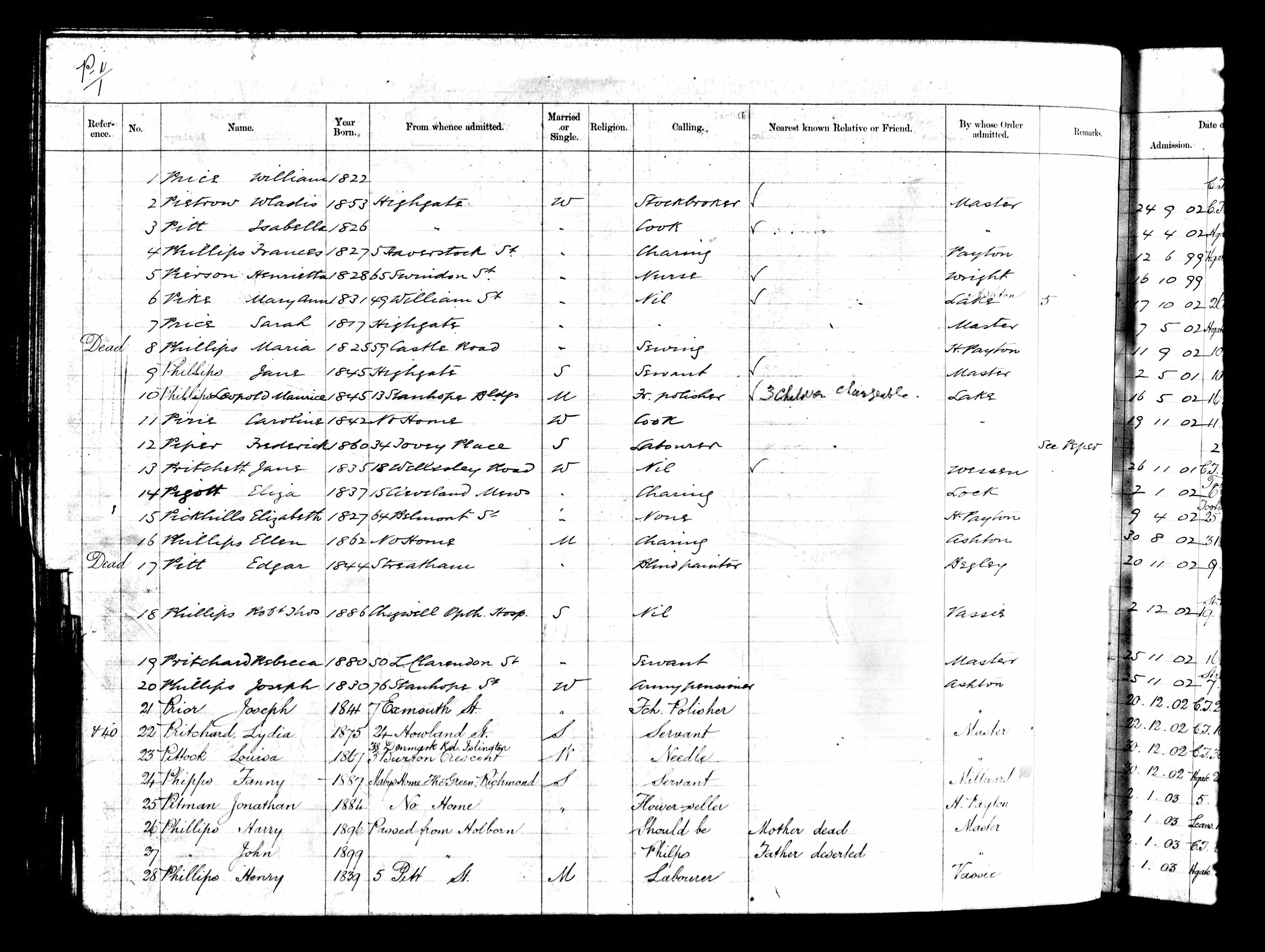 St Pancras Workhouse at 64 Belmont Street, Admitted 9-4-02, discharged 25-2-03