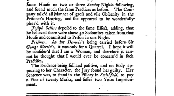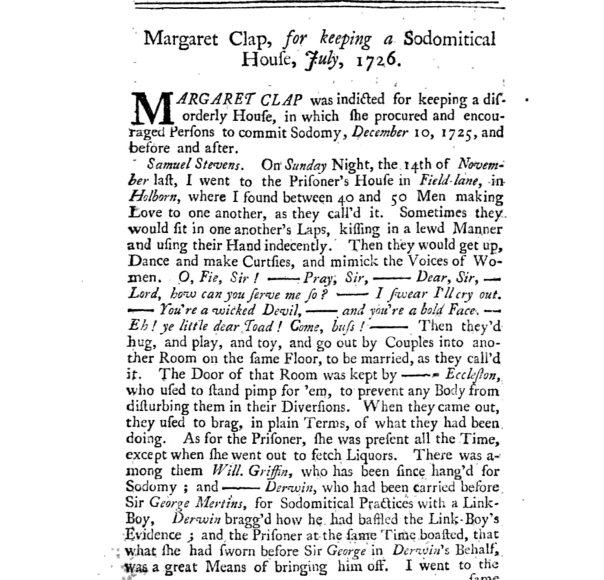 SAMUEL STEVENS: On Sunday Night, the 14th of November last, I went to the Prisoner’s House in Field-lane in Holbourn [in the City of London], where I found between 40 and 50 Men making Love to one another, as they call’d it. Sometimes they would sit in one anothers Laps, kissing in a leud Manner, and using their Hand[s] indecently. Then they would get up, Dance and make Curtsies, and mimick the Voices of Women. O, Fire, Sir! — Pray Sir. — Dear Sir. — Lord, how can you serve me so? — I swear I’ll cry out. — Your’re a wicked Devil, — and you’re a bold Face. — Eh ye little dear Toad! Come, buss! — Then they’d hug, and play, and toy, and go out by Couples into another Room on the same Floor, to be marry’d, as they call’d it. The Door of that Room was kept by —— Eccleston, who used to stand pimp for ’em to prevent any Body from disturbing them in their Diversions. When they came out, they used to brag, in plain Terms, of what they had been doing. As for the Prisoner, she was present all the Time, except when she went out to fetch Liquors. There was among them Will Griffin, who has been since hang’d for Sodomy; and —— Derwin, who had been carried before Sir George Mertins* for Sodomitical Practices with a Link-Boy [boy who carries a torch before gentleman to light their way in the streets at night]. Derwin brag’d how he had baffled the Link-boy’s Evidence; and the Prisoner at the same Time boasted that what she had sworn before Sir George in Derwin’s Behalf, was a great Means of bringing him off [i.e. getting him acquitted]. I went to the same House on two or three Sunday Nights following, and found much the same Practices as before. The Company talk’d all manner of gross and vile Obscenity in the Prisoner’s hearing, and she appear’d to be wonderfully pleas’d with it.