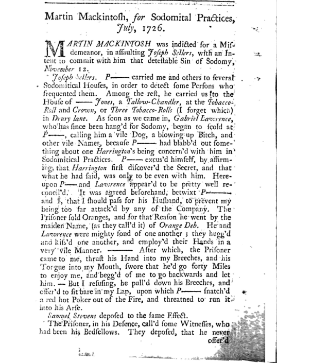 14. Rictor Norton (Ed.), “The Trial of Martin Macintosh, 1726”, Homosexuality in Eighteenth-Century England: A Sourcebook. 1 Dec. 1999, updated 20 June 2008 http://rictornorton.co.uk/eighteen/1726mack.htm