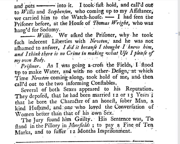 WILLIS: We asked the Prisoner why he took such indecent Liberties with Newton, and he was not ashamed to answer, I did it because I thought I knew him, and I think there is no Crime in making what use I please of my own Body.