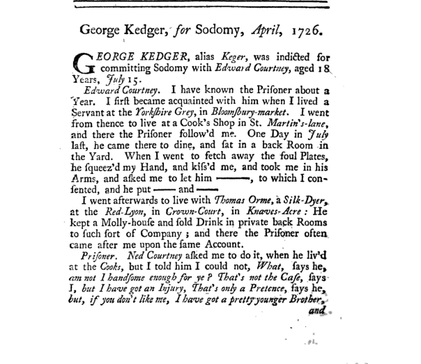 12. Rictor Norton (Ed.), “The Trial of George Kedger, 1726”, Homosexuality in Eighteenth-Century England: A Sourcebook. 1 Dec. 1999, updated 20 June 2008 http://rictornorton.co.uk/eighteen/1726kedg.htm
