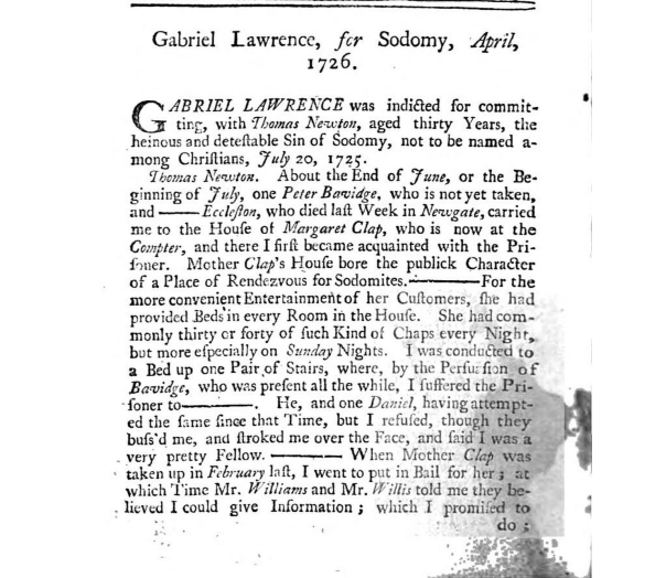 THOMAS NEWTON: About the end of June, or the beginning of July, one Peter Bavidge, who is not yet taken [captured], and —— Eccleston, who died last Week in Newgate, carried me to the House of Margaret Clap, who is now in the Compter, and there I first became acquainted with the Prisoner. Mother Clap’s House bore the publick Character of a Place of Rendezvous for Sodomites. — For the more convenient Entertainment of her Customers she had provided Beds in every Room in the house. She had commonly thirty or forty of such Kind of Chaps every Night, but more especially on Sunday Nights. I was conducted to a Bed up one Pair of Stairs, where, by the Persuasion of Bavidge, who was present all the while, I suffered the Prisoner to ——. He, and one Daniel, have attempted the same since that Time, but I refus’d, though they buss’d [kissed] me, and stroked me over the Face, and said I was a very pretty Fellow. — When Mother Clap was taken up [arrested] in February last, I went to put in Bail for her; at which Time Mr. Williams and Mr. Willis [two Reforming Constables] told me they believed I could give Information; which I promised to do; but at the End of the same Month I was taken up myself.