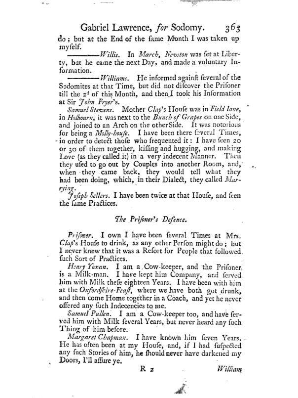 SAMUEL STEVENS. Mother Clap’s House was in Field-lane, in Holbourn. It was next to the Bunch of Grapes on one Side, and join’d to an Arch on the other Side. It was notorious for being a Molly-house. I have been there several Times, in order to detect those who frequented it: I have seen 20 or 30 of them together, kissing and hugging, and making Love (as they called it) in a very indecent Manner. Then they used to go out by Couples into another Room, and when they came back, they would tell what they had been doing, which, in their Dialect, they called Marrying.