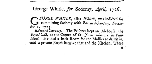 15. Rictor Norton (Ed.), “The Trial of George Whittle, 1726”, Homosexuality in Eighteenth-Century England: A Sourcebook. 1 Dec. 1999, updated 20 June 2008 http://rictornorton.co.uk/eighteen/1726whit.htm