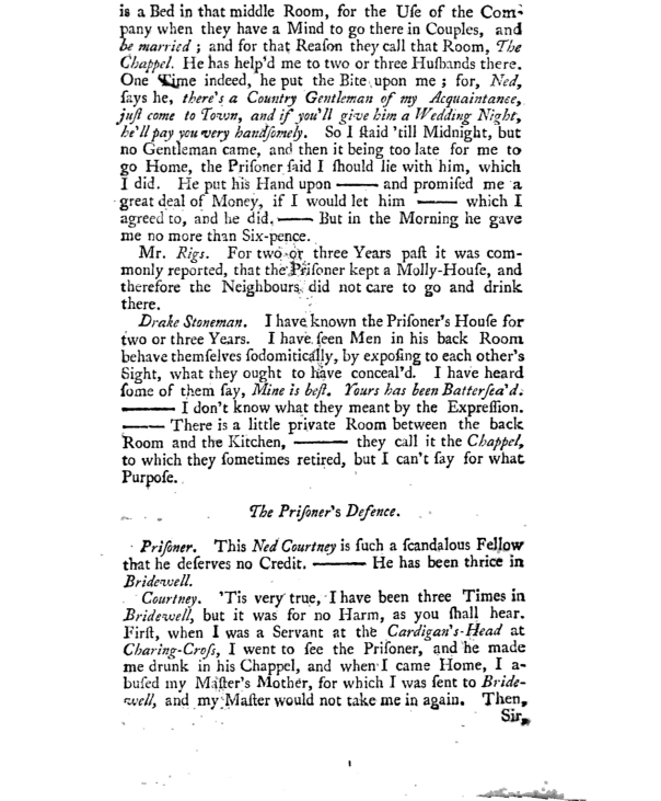 EDWARD COURTNEY. The Prisoner kept an Alehouse, the Royal-Oak, at the Corner of St. James’s-Square, in Pall Mall. He had a back Room for the Mollies to drink in, and a private Room betwixt that and the Kitchen. There is a Bed in that middle Room, for the Use of the Company when they have a Mind to go there in Couples, and be married; and for that Reason they call that Room, The Chappel. He has help’d me to two or three Husbands there. One Time indeed, he put the Bite upon me; for, Ned, says he, there’s a Country Gentleman of my Acquaintance, just come to Town, and if you’ll give him a Wedding Night, he’ll pay you very handsomely. So I staid ’till Midnight, but no Gentleman came, and then it being too late for me to go Home, the Prisoner said I should lie with him, which I did. He put his Hand upon —— and promised me a great deal of Money, if I would let him —— which I agreed to, and he did. — But in the Morning he gave me no more than Six-pence.