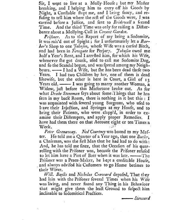 PRISONER. As to the Report of my being a Sodomite, it was rais’d out of Spight; for I unfortunately let a Barber’s Shop to one Johnson, whose Wife was a cursed Bitch, and had been in Newgate for Perjury. Johnson owed me half a Year’s Rent, and I arrested him, for which his Wife, whenever she got drunk, used to call me Sodomite Dog, and so the Scandal begun, and was spread among my Neighbours. — I had a Wife, but she has been dead these two Years. I had two Children by Her, one of them is dead likewise, but the other is here in the Court, a Girl of 13 Years old. — I was going to marry another Woman, a Widow, just before this Misfortune broke out. — As for what Drake Stoneman says about some Things that he has seen in my back Room, there is nothing in it but this: I was acquainted with several young Surgeons, who used to leave their Injections, and Syringes at my House, and to bring their Patients, who were clapp’d [had venereal disease], in order to examine their Distempers, and apply proper Remedies. I have had them there on that Account eight or ten Times a Week.