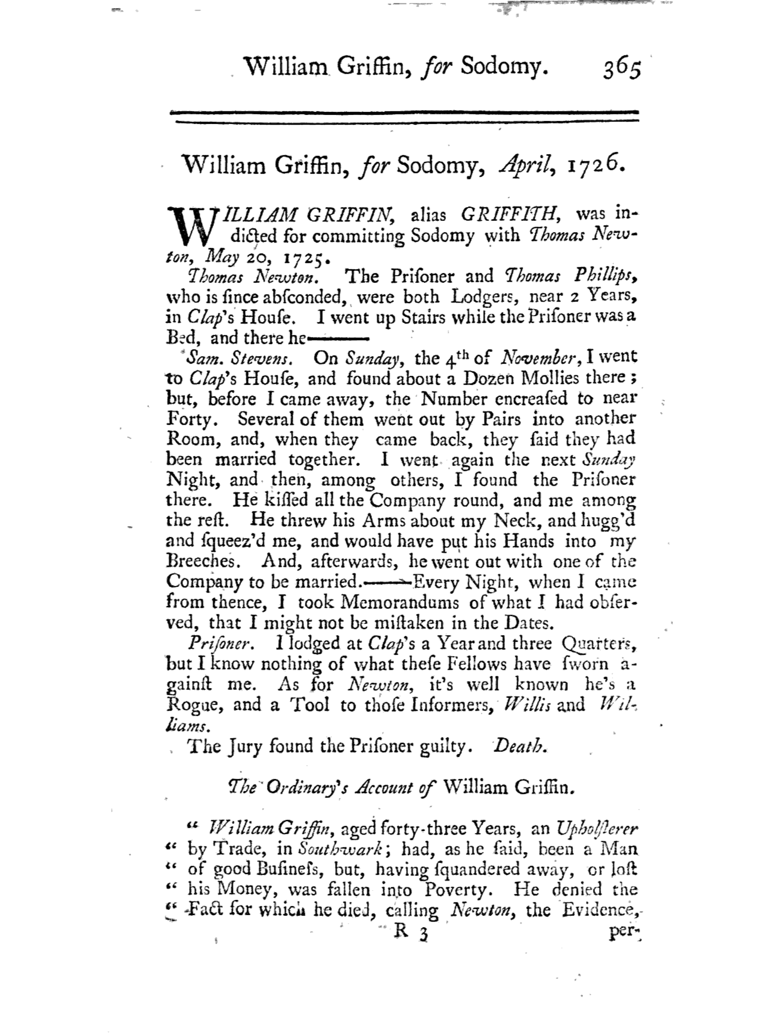 11. Rictor Norton (Ed.), “The Trial of William Griffin, 1726”, Homosexuality in Eighteenth-Century England: A Sourcebook. 1 Dec. 1999, updated 20 June 2008 http://rictornorton.co.uk/eighteen/1726grif.htm