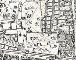 map of London, Anthonis van den Wyngaerde’s copper engraving of 1558/9Nearby North Folgate was the home of gay dramatist Christopher Marlowe in 1589, and he fought a duel, by sword, in Hog Lane…now Worship Street, a few blocks north of Christopher Street, opposire Moorfields. This was to gecome a red light district of hovels, filthy cottages & laystalls. Pepys in his Diary for 24 March 1668, recorded a “Tumult near Moorfields, the “prentices pulling down the brothels . . . which is one of the great grievances of the nation”.