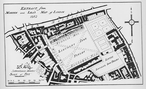 Moorfields, from a copperplate map of London.Lincoln’s Inn.