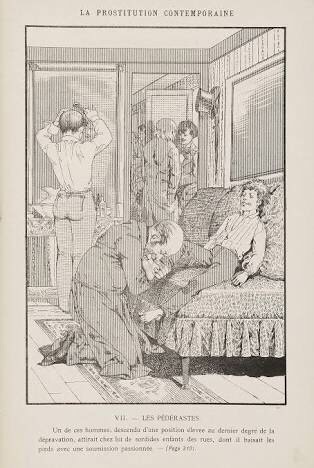 Molly-houses were often considered as brothels in legal proceedings.[1] A male brothel, illustration by Léon Choubrac (known also as Hope), included in Léo Taxil’s book La prostitution contemporaine, 1884, pg. 384, Plate VII.Field Lane environs, Holborn