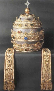 The Papal Tiara (Triregnum) is the three-tiered jewelled papal crown, supposedly of Byzantine and Persian origin, that is a prominent symbol of the papacy. The Supreme Pontiff’s arms have featured a “tiara” since ancient times, notably in combination with Saint Peter’s crossed keys. Though not currently worn as part of papal regalia (though still permissible), the continuing symbolism of the papal tiara is reflected in its use on the flag and coats of arms of the Holy See and the Vatican. Although often referred to as the Papal Tiara, historically there have been many, and twenty-two remain in existence. [Wikipedia]