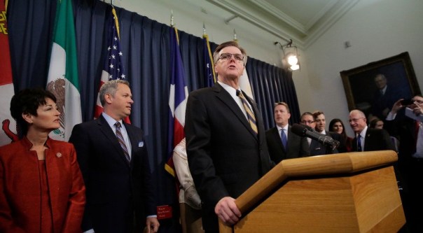 Texas Lt. Gov. Dan Patrick, center, announces “Operation One Million Voices” to promote Senate Bill 6, the so-called bathroom bill, on March 6, 2017. The effort is being lead by Vision America and the Family Research Council, two groups with long histories of opposing LGBT rights. (Eric Gay / AP)