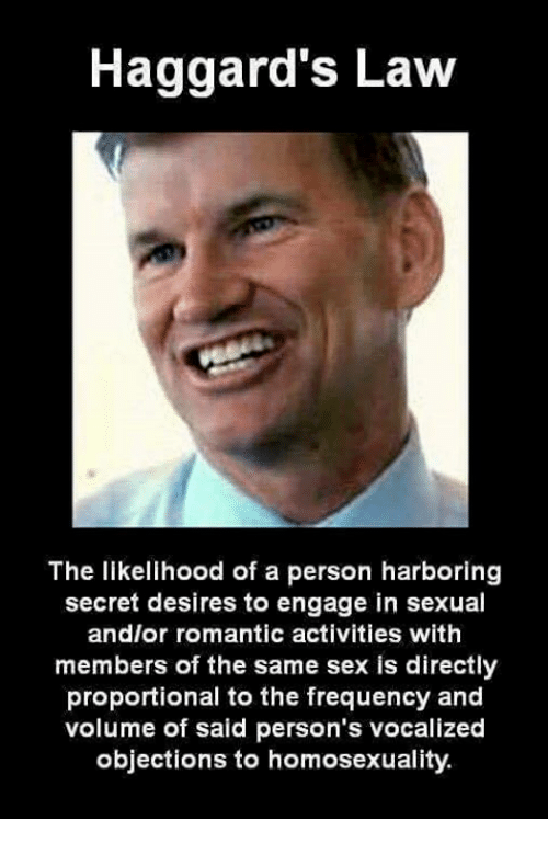 Haggard’s Law is an adage named after Pastor Ted Haggard — despite his not being gay in any way, shape or form. It is used as a purely sarcastic musing that people who strongly object to homosexuality may be likely to engage in homosexual activities, and is based on the numerous public scandals of famous figures who oppose homosexuality and homosexual behavior.