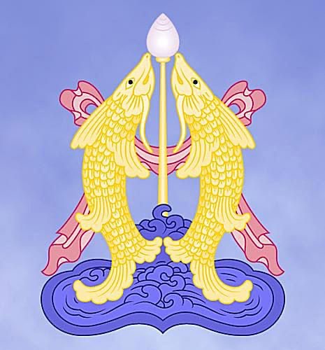 The two fish were originally symbolic of the rivers Ganges and Yamuna, but came to represent general good fortune for Hindus, Jainists, and Buddhists. Within Buddhism, it also symbolizes that living beings who practice the dharma need have no fear to drown in the ocean of suffering, and can freely migrate (chose their rebirth) like fish in the water.