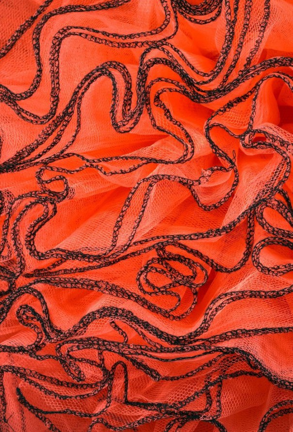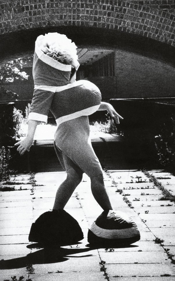 Bowery had already attempted to distort his own body with unorthodox combinations of clothing forms and the deception of make-up. The Pregnant tutu head‘s top has a protruding belly suggesting the silhouette of a pregnant woman and the continuation of the species; it is worn with stretch pants. To continue this exaggerated silhouette and reinforce the symbol of growth, Bowery crafted half-circle, fabric shoes from large pieces of foam rubber covered in brown fabric. The bulbous shoes look ridiculous, like the cartoon models worn by Mickey and Minnie Mouse. The headpiece is formed like a large pompom made from tiers of orange tulle frills zipping up the back; the wearer encapsulated in a puff of fabric. A pair of full-length, dark blue gloves complete this ensemble. Bowery’s 1990s clothing is often visually disturbing, as he experimented with costume freakery.