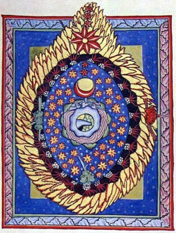 Hildegard von Bingen was one of the most industrious people of the Middle Ages, period. She was a Benedictine abbess who is often credited as being the founder of natural history in Germany. She was also a writer, composer, philosopher, and receiver of religious visions. For all of her innovating, Pope Benedict XVI named her a Doctor of the Catholic Church in 2012. She proposed that the cosmos were arranged into a fiery cosmic egg. It sounds pretty scary, but Hildegard saw it is a reflection of God’s vision – the egg of the cosmos followed a divine patterning. The outermost layer of the egg is fire, representing purification and judgement; the next layer is ethereal firmament, which signifies faith; the next is water, the element for baptism; and finally, there’s the Earth itself, which is made up of four elements.