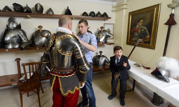 Christoph Graf, the 35th commander of the Pontifical Swiss Guard, is dressed by an assistant as his son plays. Photograph: Christian Sinibaldi