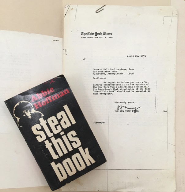 Some of the artifacts in the collection display other sides of Mr. Hoffman’s protean personality: a sober term paper he wrote at Brandeis University about “Internal Group Conflict in the Jewish Community of Worcester, Massachusetts,” for which he received an A grade; a stub of a $150 ticket to Madison Square Garden for the 1971 so- called Fight of the Century between Joe Frazier and Muhammad Ali; several letters defending his authorship of “Steal This Book” in the face of charges from an East Village buddy that he had stolen the text from him.