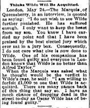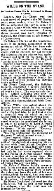 It was on this day (26 May) in 1895 that playwright Oscar Wilde was taken off to Reading Gaol, having been convicted of sodomy. This was a sensational trial. Historians of sexuality would want to note that homosexuality had only recently been made illegal in the UK. Below are two accounts of the trial and its conclusion. The first is from the Lowell Daily Sun (MA) 25 May 1895. The second article is from the Evening Herald (Syracuse, NY) 24 May 1895.