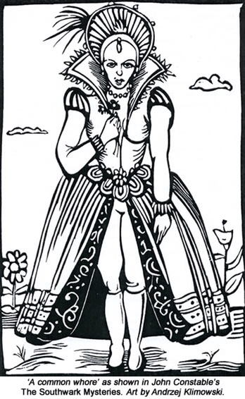 Older bodies were dug up again with indecent despatch to make more space in the ground. All over London, disinterred bones were thrown into the graveyard’s charnel house. This was either a vault beneath the church itself or a small building on the grounds, where “clean” bones – those from which all the flesh had rotted away – could be consigned. In calmer times, these bones would be treated with great reverence, perhaps even prayed over by the priest, but when the pressure on graveyards hit these heights, speed was all that mattered. (49) “Burial arrangements could break down during epidemics,” writes Reading University’s Professor Ralph Houlbrooke. “The Black Death compelled urban communities in particular to find new burial space quickly.” There’s no evidence that Cross Bones itself was used for burials this early, but it may well have been a later outbreak of plague in London which forced St Saviour’s parish to requisition the site. (50) In 1349, Edward III suspended Parliament to let MPs escape London for the relative safety of the British countryside. Anyone else rich enough to flee the capital got out too. Southwark’s brothels seem to have remained open throughout the plague years, however, despite official warnings that casual copulation with multiple partners increased the risk of infection. Henry Knighton, a 14th century historian who lived through the Black Death, says the stews were actually busier than ever during the plague years. Many Londoners adopted an attitude of fatalistic abandon, thinking it was all but certain they’d catch the plague anyway, so why not do so in the arms of their favourite Bankside whore? At least that guaranteed you a little pleasure before you died. In the spring of 1350, the death toll in London started to abate at last and Edward turned his attention to the anarchy that now prevailed in Southwark. Many of the Bishop’s officials had fled during the plague years, leaving the Bankside brothels and their surrounding taverns more lawless than ever. Anyone committing a crime inside the city walls knew they had only to get across London Bridge to claim sanctuary and the welcome they now found there was warmer than ever. “Those who have committed manslaughter, robberies and diverse other felonies are privily departing into the town of Southwark, where they cannot be attached by the ministers of the City and there are openly received, ” said the King in an address to London’s people. “And so, for default of due punishment [they] are emboldened to commit more such felonies.” If those felonies had been limited to Southwark alone, Edward might have found them easier to bear. By now, though, Southwark’s thugs had grown so bold that gangs of 200 or more youths would periodically burst over the bridge into London, rob the passers-by there, loot the shops and then dash back across the river to safety. Only London had the men and resources needed to restore law and order in Southwark, but no-one who lived there was willing to call them in if it meant surrendering their borough’s treasured independence. The result was an uneasy stand-off. As far as London itself was concerned, the authorities concentrated on preventing prostitution within the city walls and on ensuring that the girls working designated areas like Cock Lane wore the proper clothing. This takes us back to the 1161 rules’ requirement that whores must clearly identify themselves by wearing some agreed garment. In 1351, the City of London passed an ordinance saying “lewd or common women” must wear a striped hood to identify themselves as such and refrain from beautifying their clothes with any fur trim or fancy lining. Any woman not of noble birth could be described as “common” in that sense and this sloppy wording made the ordinance such a wide one that it seemed to cover almost every female in the city. London’s proud womenfolk weren’t going to have men dictating what they could wear, so most simply ignored the ordinance and challenged any constable to arrest them if he dared. When Edward III put his own authority behind this law three years later, he was careful to specify it applied only to London’s “common whores”. The striped hoods and lack of decorative trim, his proclamation declared, would “set a deformed mark on foulness to make it appear more odious”. Some working girls continued to live inside the city walls but commuted to Cock Lane or the Liberty to earn their daily crust – perhaps finding somewhere to change on the way. But wasn’t long before they were banned from even lodging in the city and subject to very heavy penalties for doing so. A 1383 ordinance required whores caught in London to have their heads shaved and then be carted through the streets in a special wagon while minstrels played all around them to attract a crowd. The girl herself would have to wear that trademark hood as the cart carried her through town to the nearest prison, where she’d be placed in a pillory and publicly whipped. “The ineffectuality of all this punishment is evident in the ordinances themselves, which provide for repeated offences and increased penalties,” Burford says. Offenders caught a second time, for example, would serve ten days in jail on top of all the other penalties, while a third offence got you ten days’ prison and permanent expulsion from London. A girl in this final category would be taken to one of the city gates, where she’d be roughly thrown outside. If the authorities had been able to trace her origins to Bankside – as was often the case – she’d be escorted back there and warned to stay put. In 1393, these rules were tightened once again, saying no prostitute must “go about or lodge” in London or its suburbs, but “keep themselves in the places thereto assigned, that is to say, the stews on the other side of the Thames and in Cock Lane”. Offenders could face all the penalties detailed above a