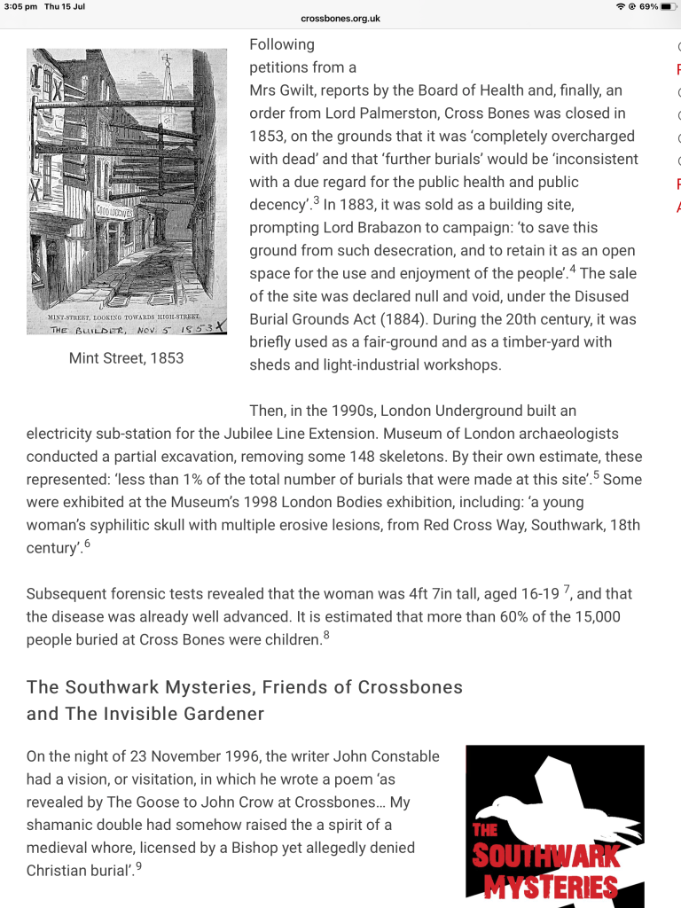 By the early 1850’s the graveyard was at bursting point, with one commentator writing that it was “completely overcharged with dead”. Due to health and safety concerns the graveyard was abandoned, and subsequent redevelopment plans (including one to turn it into a fairground!) were all fought off by local residents.In 1992, the Museum of London carried out an excavation on Cross Bones Graveyard, in collaboration with the ongoing construction of the Jubilee Line Extension. Out of the 148 graves they excavated, all dating from between 1800 to 1853, they found 66.2% of the bodies in the graveyard were aged 5 years or younger indicating a very high infant mortality rate (although the sampling strategy used may have overindexed this age group). It was also reported that the graveyard was extremely overcrowded, with bodies piled one on top of each other. In terms of the causes for death, these included common diseases of the time including smallpox, scurvy, rickets and tuberculosis.