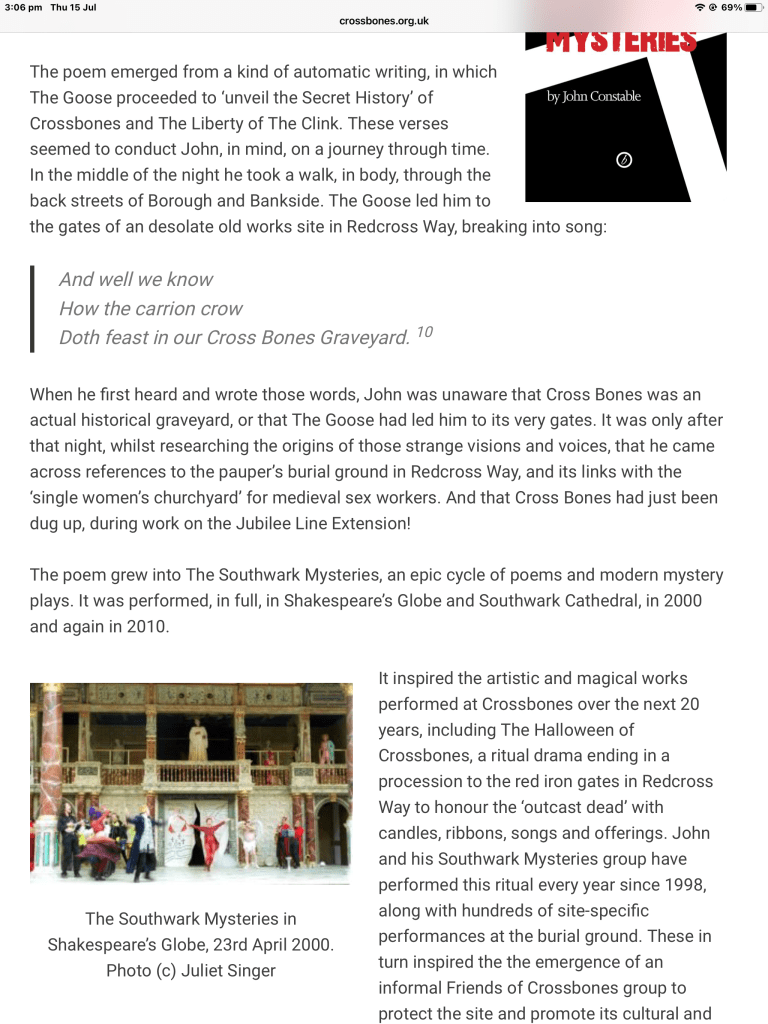 “I have heard ancient men of good credit report, that these single women were forbidden the rights of the Church, so long as they continued that sinful life, and were excluded from Christian burial, if they were not reconciled before their death. And therefore there was a plot of ground, called the single woman’s churchyard, appointed for them, far from the parish church.” Over time, Cross Brones Graveyard started to accommodate other members of society who were also denied a Christian burial, including paupers and criminals. With Southwark’s long and sordid past as “the pleasure-garden of London”, with legalised bear-baiting, bull fighting and theatres, the graveyard filled up extremely quickly.