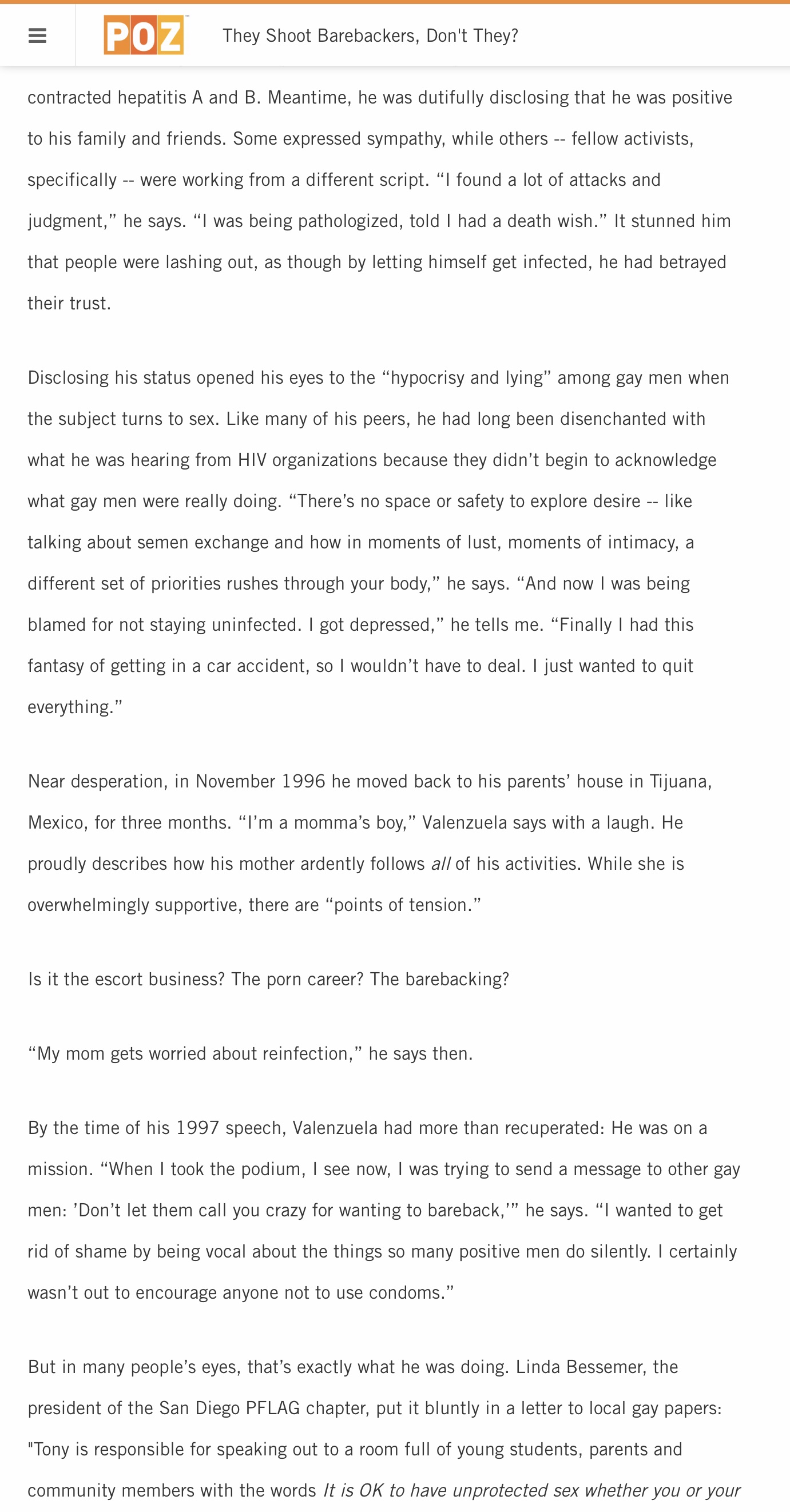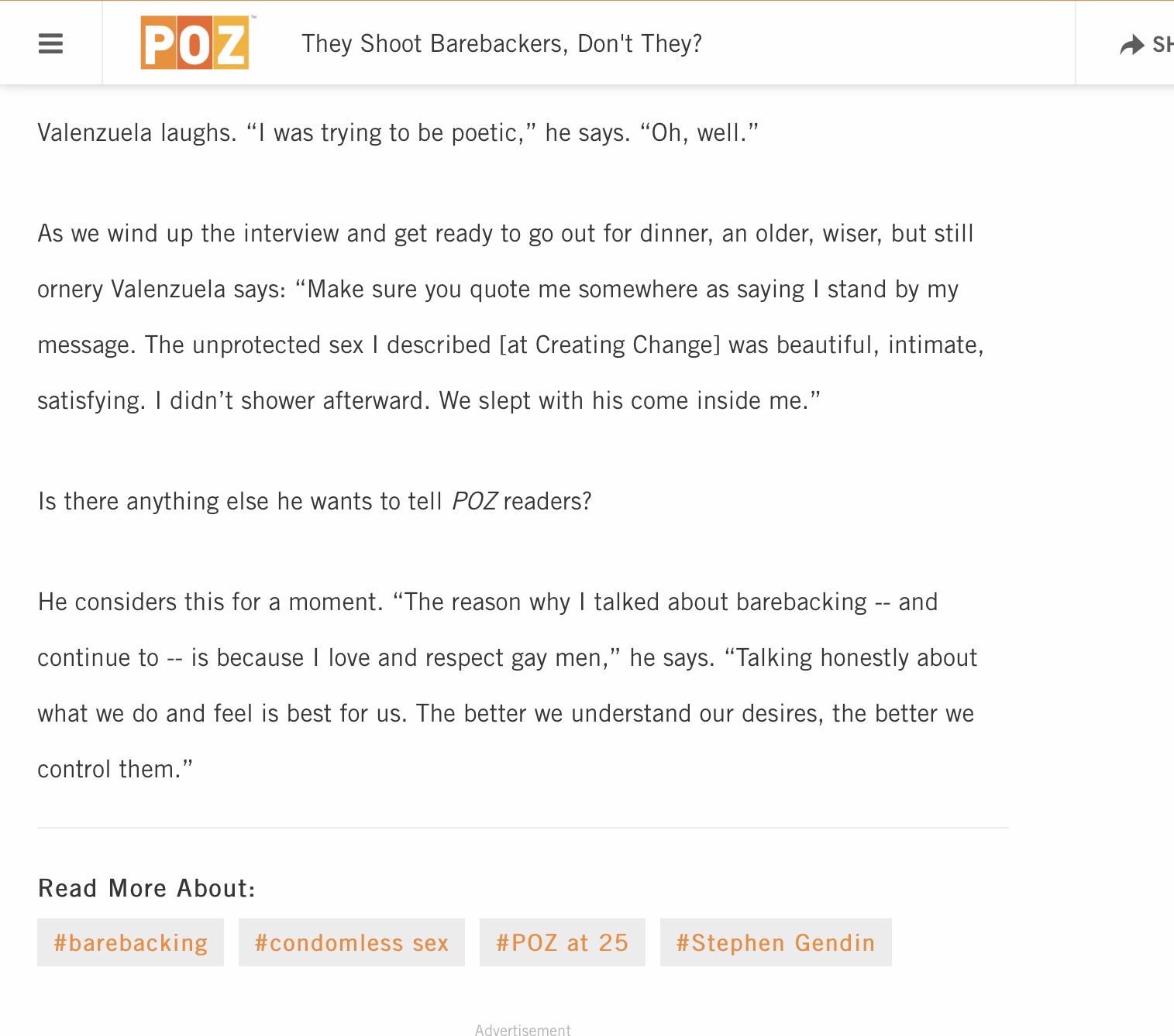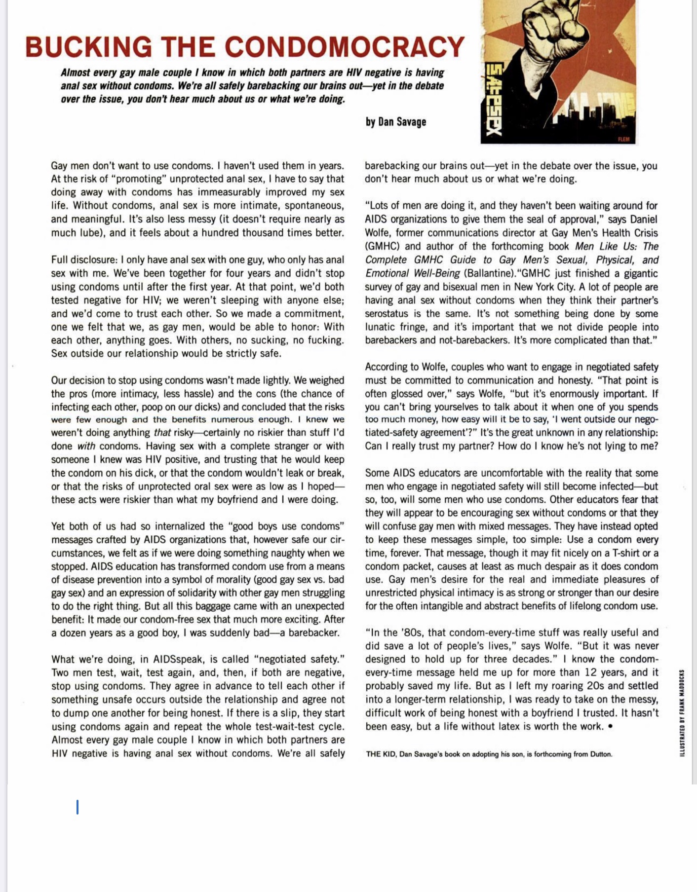 Below is my original article with the articles now included. At the end is letters published regarding the “Bucking the Condomocracy” article, and a more recent article on the same subject. My bug chasing article can be found on this blog simply by searching for “barebacking”.