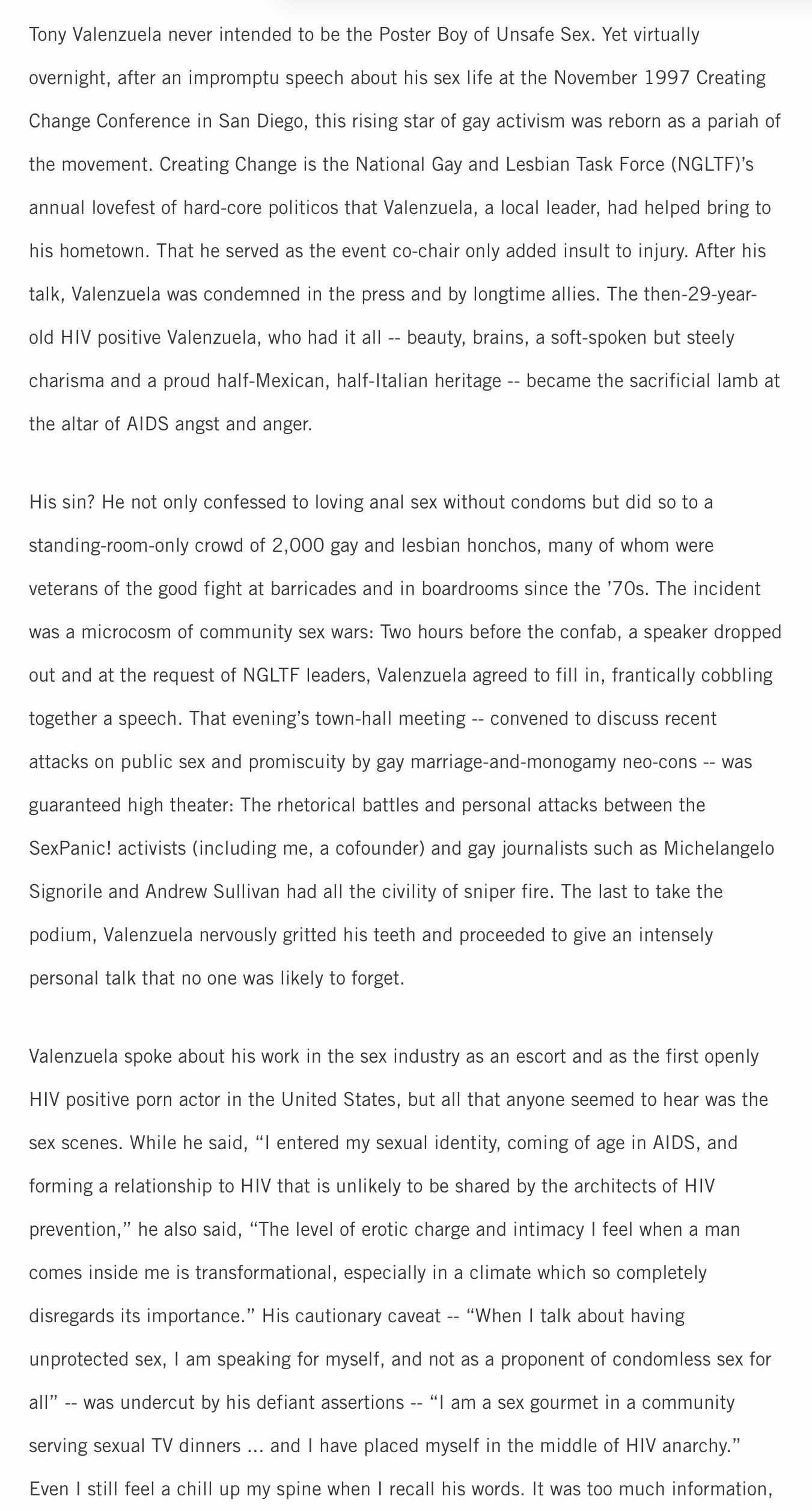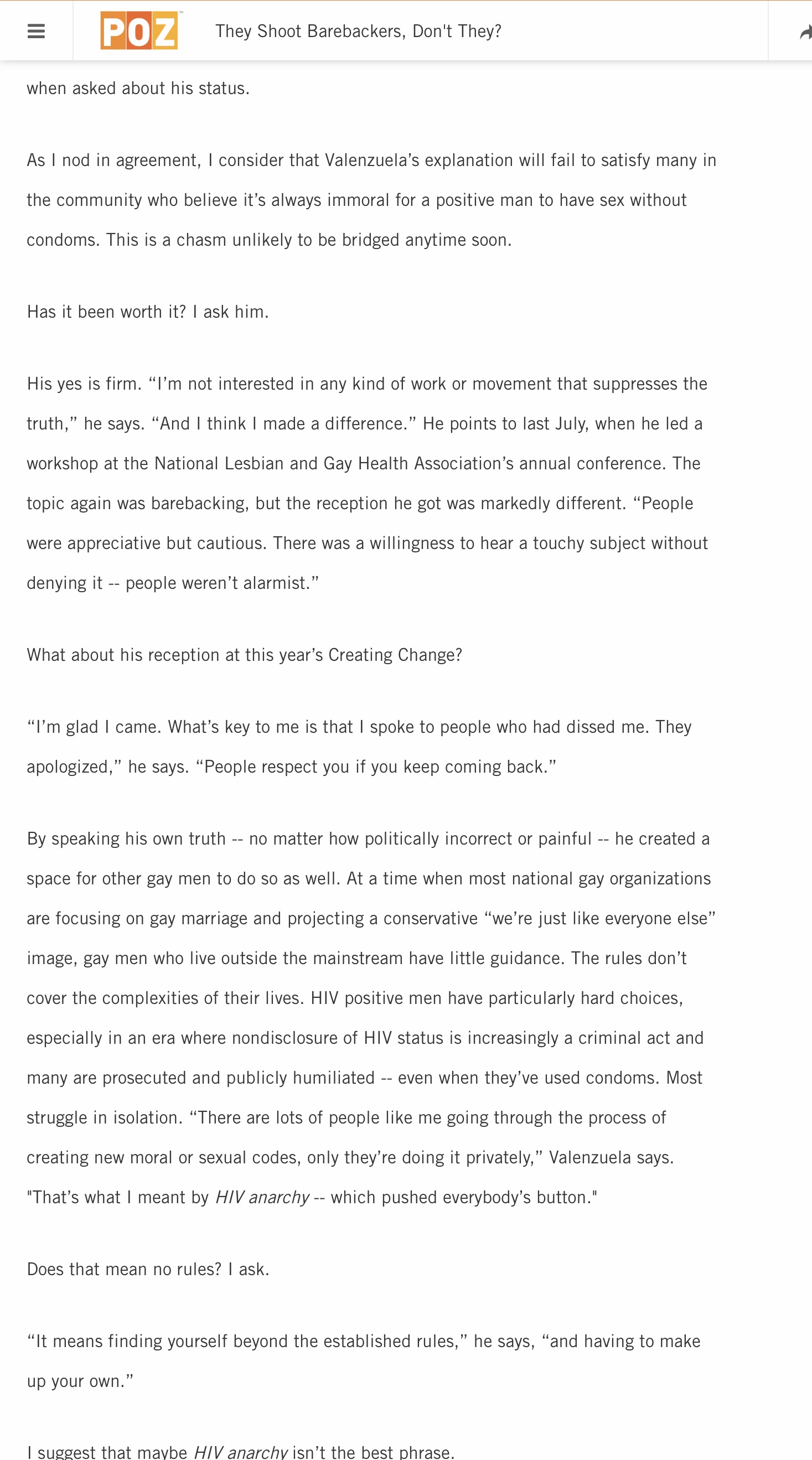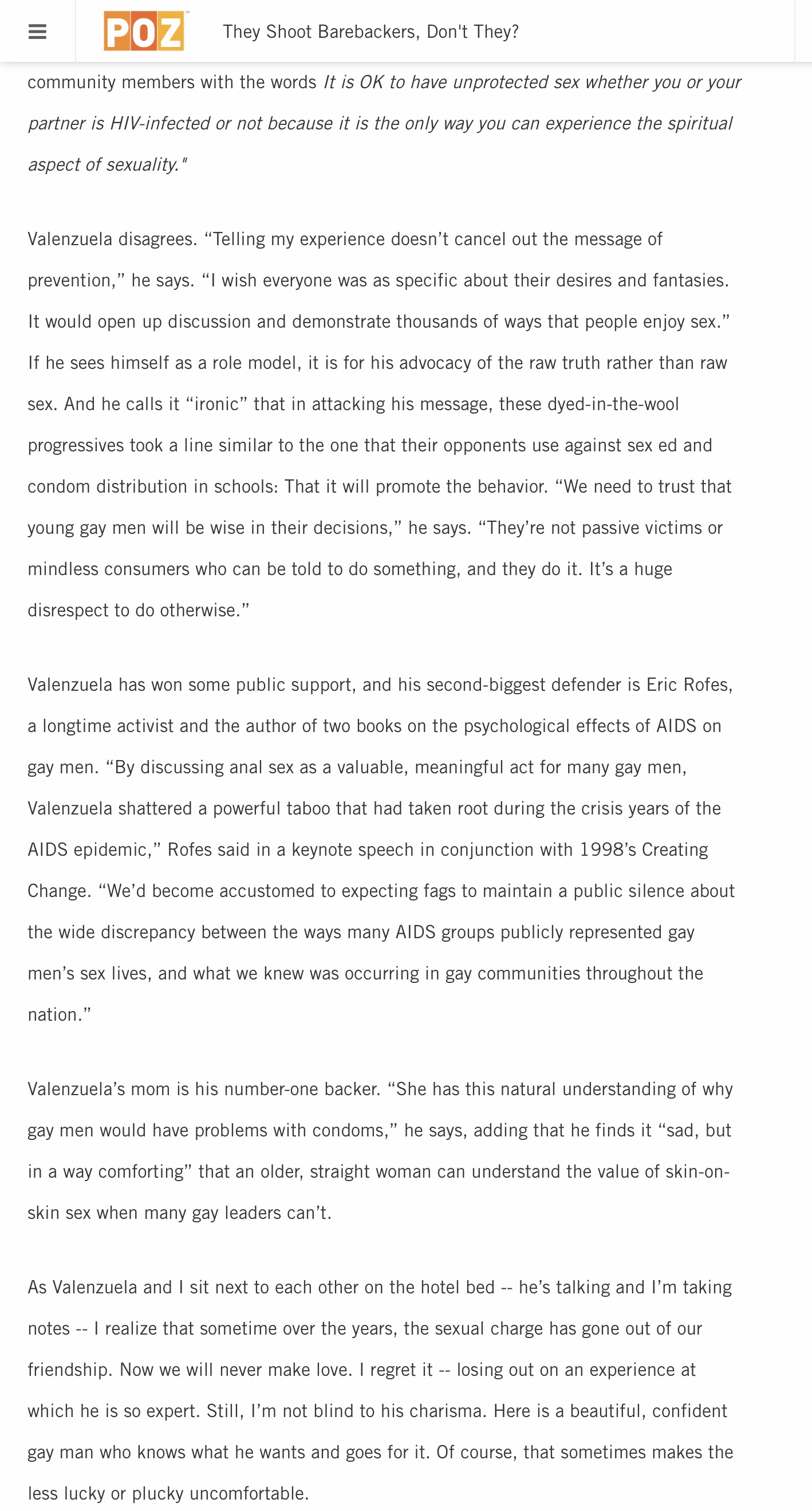 Below is my original article with the articles now included. At the end is letters published regarding the “Bucking the Condomocracy” article, and a more recent article on the same subject. My bug chasing article can be found on this blog simply by searching for “barebacking”.