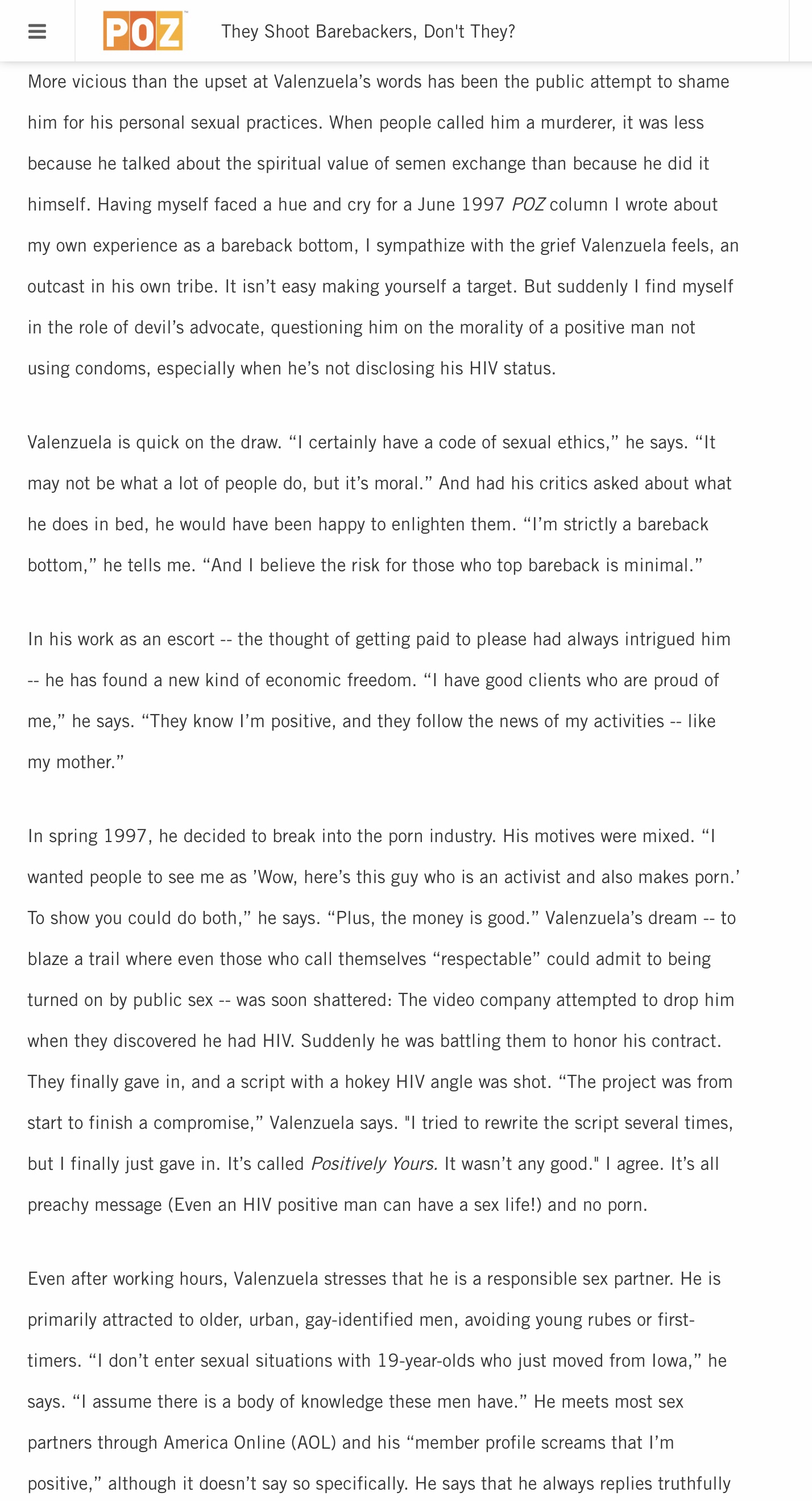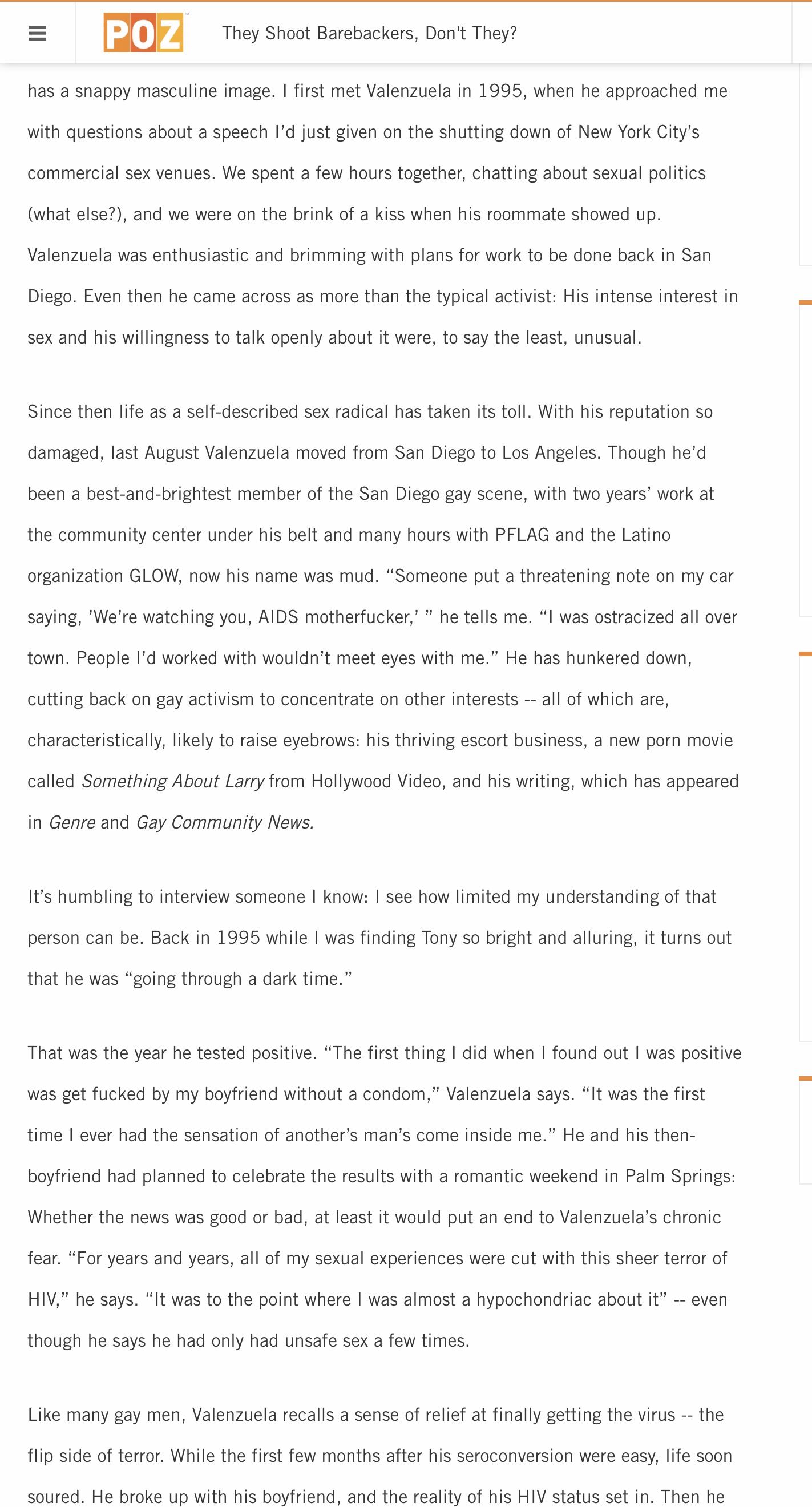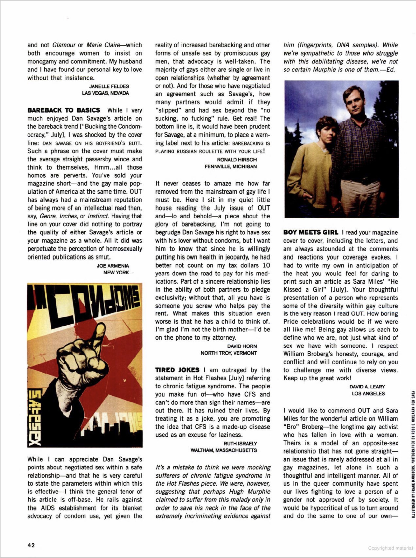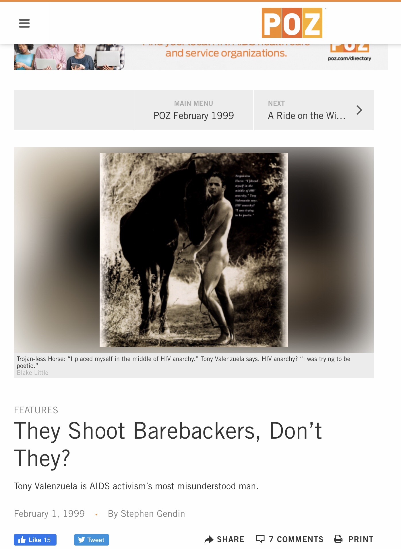 In 1999, both “Blue” magazine (the “Bucking the Condomocracy” article, also reprinted in “Out” Magazine, July 1999, Vol. 7, No.12), and “HQ” magazine (“They Shoot Barebackers Don’t They?”) published articles on barebacking, the one in “HQ” being a reprint of an article from “Poz” magazine. The latter caused a bit of a furore in both “The Sydney Star Observer”, and in the “Sydney Morning Herald”…probably understandably. Read in the context of HIV education and safe sex messages at that time, they read almost as a promotion of barebacking.