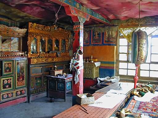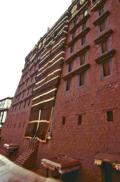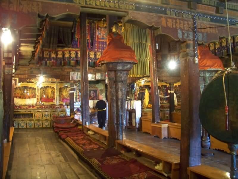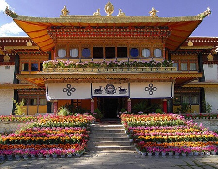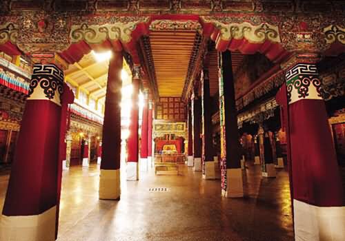 The earliest building is the Kelsang Palace built by the Seventh Dalai Lama which is “a beautiful example of Yellow Hat architecture. Dalai Lamas watched, from the first floor of this palace, the folk operas held opposite to the Khamsum Zilnon during the Shoton festival. Its fully restored throne room is also of interest.”
