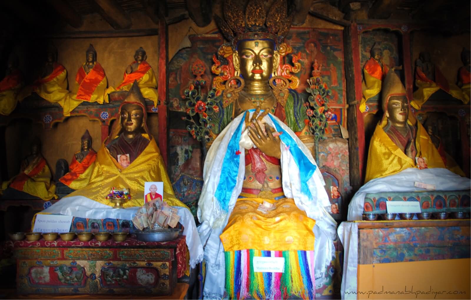 In addition to the main hall and its adjoining halls, on both sides of the Buddha Hall are dozens of 20-square-metre (220 sq ft) chapels. The Prince of Dharma chapel is on the third floor, including sculptures of Songtsen Gampo, Princess Wencheng, Princess Bhrikuti, Gar Tongtsan (the Tabo minister) and Thonmi Sambhota, the inventor of Tibetan script. The halls are surrounded by enclosed walkways.