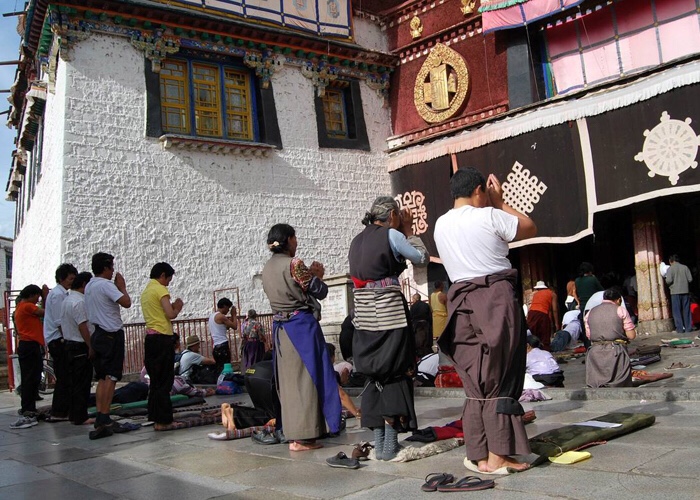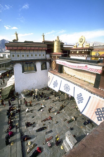 Pilgrims prostrating before entering the Johkang Temple, Lhasa, Tibet
