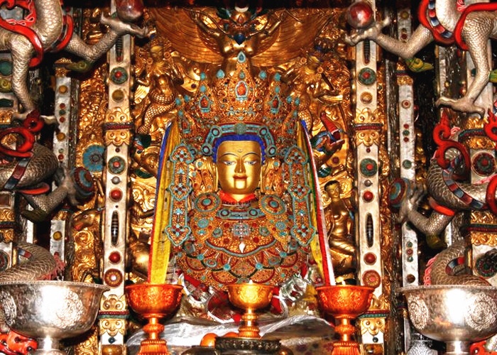 The central Buddha Hall is tall, with a large, paved courtyard. A porch leads to the open courtyard, which is two concentric circles with two temples: one in the outer circle and another in the inner circle. The outer circle has a circular path, with a number of large prayer wheels (nangkhor); this path leads to the main shrine, which is surrounded by chapels. Only one of the temple murals remains, depicting the arrival of Queen Wencheng and an image of the Buddha. The image, brought by the king’s Nepalese wife and initially kept at Ramoche, was moved to Jokhang and kept in the rear center of the inner temple. This Buddha has remained on a platform since the eighth century; on a number of occasions, it was moved for safekeeping. The image, amidst those of the king and his two consorts, has been gilded several times. In the main hall on the ground floor is a gilded bronze statue of Jowo Sakyamuni, 1.5 metres (4 ft 11 in) tall, representing the Buddha at age twelve. The image has a bejewelled crown, cover around its shoulder, a diamond on its forehead and wears a pearl-studded garment. The Buddha is seated in a lotus position on a three-tiered lotus throne, with his left hand on his lap and his right hand touching the earth. A number of chapels surround the Jowo Sakayamuni, dedicated to gods and bodhisattvas. The most important bodhisattva here is the Avalokiteshwara, the patron saint of Tibet, with a thousand eyes and a thousand arms. Flanking the main hall are halls for Amitabha (the Buddha of the past) and Qamba (the Buddha of the future). Incarnations of Sakyamuni are enshrined on either side of a central axis, and the Buddha’s warrior guard is in the middle of the halls on the left side.