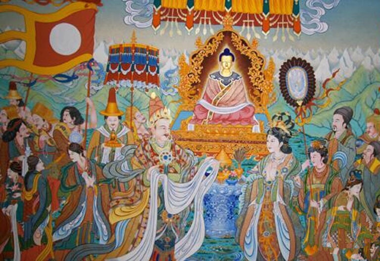 To forge ties with neighbouring Nepal, Songtsen Gampo sent envoys to King Amsuvarman seeking his daughter’s hand in marriage and the king accepted. His daughter, Bhrikuti, came to Tibet as the king’s Nepalese wife (tritsun; belsa in Tibetan). The image of Akshobhya Buddha, which she had brought as part of her dowry, was deified in a temple in the middle of a lake known as Ramoche.