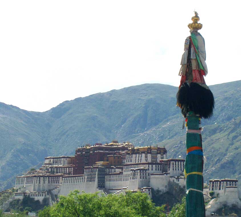 Dhvaja (Victory banner) – pole design with silk scarfs, on the background the Potala Palace